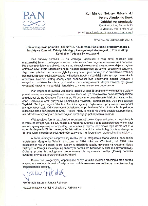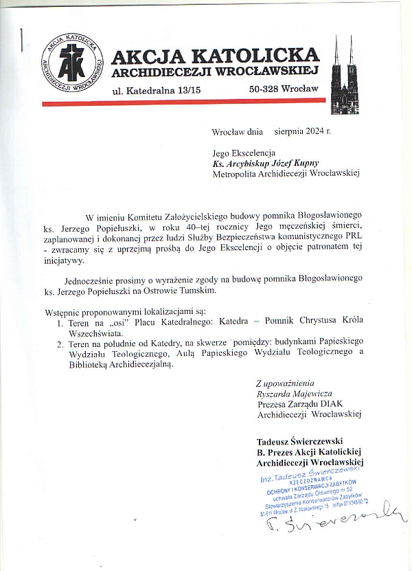 Szczęść Boże, Szanowni Państwo - Prezesi, Członkowie, Sympatycy Akcji Katolickiej - Związani Duchowo z Osobą i Posługą Błogosławionego Księdza Jerzego Popiełuszki. W roku czterdziestej rocznicy porwania i męczeńskiej śmierci, roku czternastej rocznicy beatyfikacji, roku, który został przez XXXI Krajowy Zjazd Delegatów NSZZ "Solidarność" ustanowiony "Rokiem Błogosławionego Ks. Jerzego Popiełuszki" - od 31. lipca br., tj. od dnia powołania Komitetu Założycielskiego, ten zamysł i inicjatywę objął swoim honorowym patronatem J.E. Ksiądz Arcybiskup Józef Kupny. Do pilotowania i koordynowania wszelkich działań w tym zakresie upoważniłem pana Tadeusza Świerczewskiego – jednego z założycieli reaktywowanej Akcji Katolickiej, Prezesa Stowarzyszenia Republikańsko-Narodowego i Inicjatora Tego Przedsięwzięcia. Obecnie staramy się o przyznanie godnego miejsca na Ostrowie Tumskim na lokalizację pomnika. Zostały już wykonane – między innymi – koncepcja wstępna usytuowania monumentu oraz jego model. Niniejszym, Członkowie Komitetu przystąpili do zbierania podpisów pod Wnioskiem Mieszkańców do Rady Miejskiej Wrocławia o poparcie budowy pomnika. Musimy zebrać co najmniej 1000 podpisów Mieszkańców Wrocławia - do czego zapraszam i zachęcam Prezesów, Członków, Sympatyków Akcji Katolickiej. Listy z zebranymi podpisami bardzo proszę przesyłać na adres Akcji Katolickiej Archidiecezji Wrocławskiej, ul. Katedralna 13/15, 50-328 Wrocław lub bezpośrednio do mnie. Króluj nam Chryste Ryszard Majewicz Prezes Diecezjalnego Instytutu Akcji Katolickiej Archidiecezji Wrocławskiej KLAUZULA INFORMACYJNA O OCHRONIE DANYCH OSOBOWYCH SZABLON LISTY POPARCIA WNIOSKU MIESZKAŃCÓW O BUDOWĘ POMNIKA ![]() ![]() ![]() |