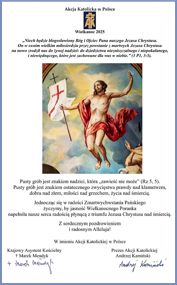 23.11.2025 r., w Święto Jezusa Chrystusa Króla Wszechświata, w asyście pocztów sztandarowych: diecezjalnego i parafialnych Oddziałów Akcji Katolickiej, odbyły się Uroczystości 30-tej Rocznicy powołania Akcji Katolickiej Archidiecezji Wrocławskiej. Uroczystości były miłą okazją aby przy Stole Pańskim podziękować wszystkim członkom – zwłaszcza tym najbardziej zaangażowanym, wspomnieć zmarłych i pomodlić się za żyjących. W tym dniu Mszy św. koncelebrowanej w Katedrze wrocławskiej przewodniczył Ks. Arcybiskup Józef Kupny. Słowo Boże wygłosił Ks. Łukasz Piłat Asystent Diecezjalny AK. Do przybyłych życzenia z błogosławieństwem skierował Ks. Arcybiskup Józef Kupny, a Ks. Marek Mendyk Biskup Świdnicki – Krajowy Asystent Akcji Katolickiej w Polsce przysłał list z podziękowaniem za zaproszenie, z zapewnieniem wszystkich o duchowej jedności wraz z serdecznymi pozdrowieniami. W Auli Papieskiego Wydziału Teologicznego o historii erygowania i działalności Akcji Katolickiej Archidiecezji Wrocławskiej wykład wygłosiła Pani Joanna Lubieniecka. Następnie, na temat teraźniejszości i przyszłości AK w Polsce opowiedział Pan Andrzej Kamiński Prezes Krajowego Instytutu Akcji Katolickiej. Po życzeniach i wystąpieniach gości – zebrani obejrzeli film pt: „Stanisław Starowieyski – życie zwyczajne – życie święte”. Na zakończenie Uroczystości wszyscy udali się pod Kolumnę Chrystusa Króla Wszechświata na Ostrowie Tumskim, gdzie Jubileuszowy Akt Przyjęcia Jezusa Chrystusa za Króla i Pana ogłosił Ryszard Majewicz – Prezes DIAK Archidiecezji Wrocławskiej. Ryszard Majewicz 2025-10-18Uroczystość Wprowadzenie Relikwii bł. St. Starowieyskiego 18 października w Warszawie w Świątyni Opatrzności Bożej odbyła się uroczystość wprowadzenie relikwii bł. Stanisława Starowieyskiego patrona Akcji Katolickiej w Polsce. W wydarzeniu uczestniczyli członkowie Akcji Katolickiej z całego kraju, w tym delegacja wrocławskiego DIAK z Prezesem Ryszardem Majewiczem i sztandarem, oraz duchowieństwo i liczni wierni. Ryszard Majewicz 2025-10-05Marsz "Wrocław dla życia"